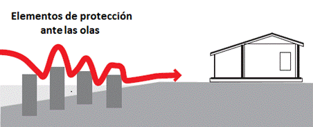 Se recomienda que las estructuras propensas al riesgo del tsunami sean elevadas sobre el nivel esperado de inundación, como se muestra en la figura 3. En áreas donde se espera que la inundación no sea mayor a un metro, se pueden colocar paredes que sirvan para absorber el golpe del agua y desviar los escombros que podría recibir la estructura, en la figura 4 se muestra el tipo de pared a instalar.