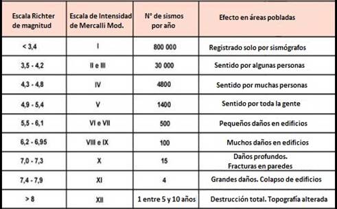 Se define a la intensidad como una medida subjetiva de la fuerza del movimiento del terreno, al no ser una medida instrumental, se utiliza una escala en donde se ubica la vibración sentida en una determinada zona y un registro de los daños causados por el sismo. Es claro a mayor intensidad, mayores serán los daños ocasionados por el terremoto en la zona.