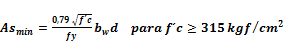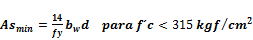 El área de acero mínima para secciones rectangulares y T con ala a tracción será: