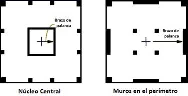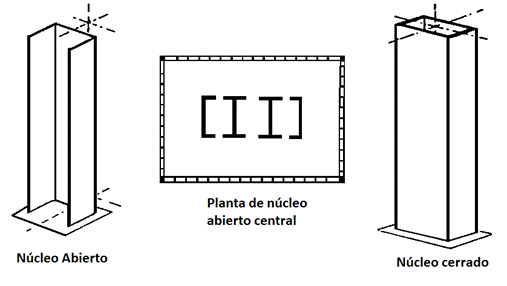 Los núcleos de muros estructurales generalmente están dispuestos en el interior de los edificios, ya sean muros con vanos que rodean los ascensores o escaleras, o sean muros completamente cerrados que permiten el paso de las instalaciones.
