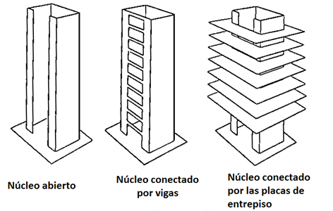 Cuando el núcleo es abierto y tiene una forma irregular como U, Z u otra forma asimétrica, se pueden producir importantes efectos de alabeo que pueden gobernar el comportamiento de la estructura, aunque generalmente los núcleos siempre están conectados por elementos rígidos, como las losas de entrepiso, o vigas de acople, los cuales pueden contribuir a resistir la torsión producida y disminuir los efectos de alabeo debido a los esfuerzos axiales. Pero de igual forma, no se puede obviar en el diseño y se deben hacer análisis complejos que deben considerar todas las características flexionales y torsionales del sistema.