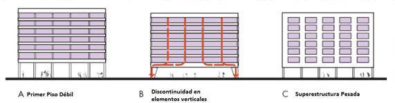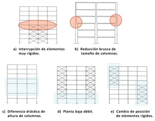 Cuando la rigidez de un edificio se encuentra irregularmente distribuida a lo largo de la altura, las mayores solicitaciones se pueden concentrar en los pisos débiles. Por esto es conveniente que no existan cambios bruscos en las dimensiones, masas, rigideces y resistencias del edificio, para evitar grandes concentraciones de esfuerzos en determinados pisos que son menos rígidos o resistentes que los demás.