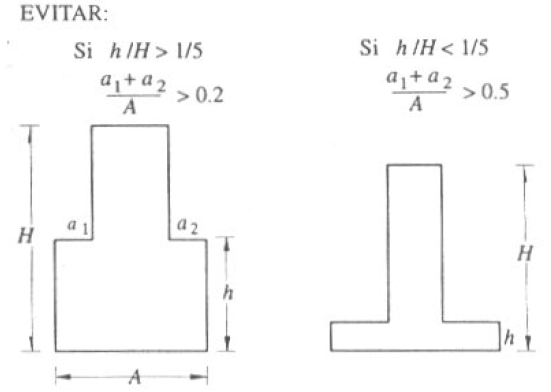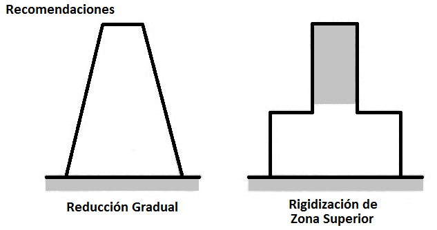 Los cambios bruscos en elevación, generalmente cuando la parte superior tiene una rigidez muy pequeña comparada a la de la base, suelen hacer que en la estructura se produzca el denominado efecto de “latigazo”, donde se produce una amplificación de los esfuerzos en los pisos donde se encuentren los cambios de rigideces. En la figura 6 se muestran relaciones de proporciones que se deben evitar y unas recomendaciones para que no se produzca el efecto de latigazo.