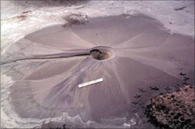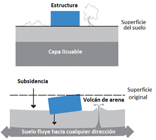 Al ocurrir un terremoto, las vibraciones que produce el sismo hacen que el suelo poco denso se reacomode y elimine espacios de vacios, lo que hace que el agua salga por los poros. Si el suelo está confinado, por lo que el agua no podría salir, aumenta la presión de poros. La presión efectiva, que es la diferencia entre la sobrepresión y la presión de poros, se reduce a cero, por lo que el esfuerzo de corte, que es directamente proporcional a la presión efectiva en los suelos sin cohesión, se vuelve nulo y el suelo pierde toda su capacidad portante y tendrá un comportamiento parecido al de una arena movediza. El agua contenida en los espacios vacios es forzada a fluir hacia arriba, donde emerge en forma de volcanes o conos que eyectan lodo y arena. Las estructuras que se encuentren sobre suelos susceptibles al fenómeno de licuefacción sufren grandes asentamientos que pueden llegar a volcarlas.