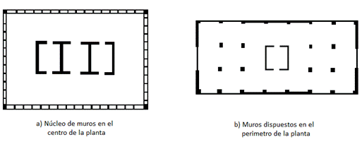 Los núcleos de muros estructurales generalmente están dispuestos en el interior de los edificios, ya sean muros con vanos que rodean los ascensores o escaleras, o sean muros completamente cerrados que permiten el paso de las instalaciones.